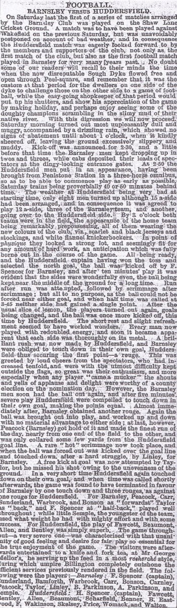 The match report on the first game appeared in the Barnsley Chronicle newspaper on Saturday the 17th of January 1874.