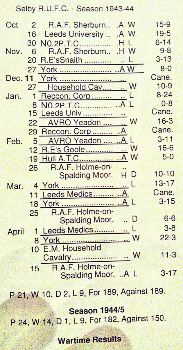 The fact that Selby managed to play right through the war was mainly because of the enthusiasm and commitment of two club officials. The brothers Don and Walter Jackson kept Selby going, arranging a full fixture list every season. Selby was situated close to a number of Services units and, by organising fixtures with these units and also encouraging Servicemen to play for the club; the Jacksons ensured that Selby was playing regularly. In the first two years of war-time rugby Selby was playing both against locally based Services teams, but also against clubs like York, York Railway Institute, Roundhay and Morley. Selby’s opportunity to play against clubs in Leeds must have decreased as the war-time travel restrictions began to have an impact, although Leeds Medics and Leeds University did continue to feature on the fixture list. The good rail links between York and Selby meant that they played against each other a number of times each season. Towards the end of the war, York was the only club team to appear regularly in Selby’s fixture list. The reports on Selby’s war-time activities gradually disappear from the local newspapers from 1943 onwards, but fortunately, as you can see from the fixture list below, Don and Walter Jackson kept records of the club’s wartime fixtures. These records indicate that Selby was very competitive during the war and when a game was lost it was often only by a few points.