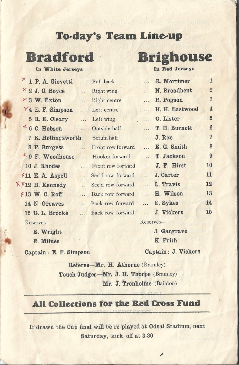 Ironically, having not entered the 1939/40 Yorkshire Cup, a competition that didn’t take place, Captain Stanley J. Rhodes from the Bradford club proposed that a 1940 cup competition should take place. A meeting of interested clubs held on the 15th of February 1940 agreed that, subject to approval from the Yorkshire Rugby Football Union, the competition would take place. It was hoped that the Wartime Cup would generate funds for the clubs that took part. A percentage of all the gate receipts were to be pooled and then shared. It was also proposed that a collection would be taken at every game with the proceeds given to the Red Cross. The Wartime Cup competition was approved by the Yorkshire RFU, sixteen clubs entered, and the draw was made on the 1st of March 1940 at the Midland Hotel, in Bradford.